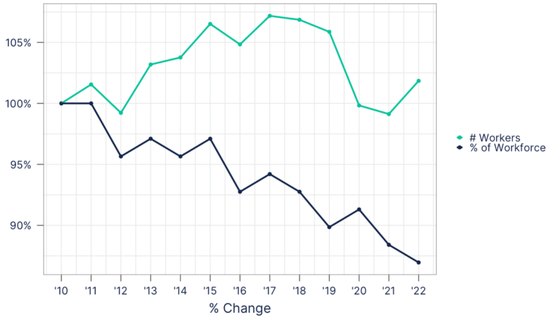 Despite the rising popularity of unions in the media, union membership count has remained relatively stable and is decreasing as a percentage of total workforce. In fact, the percentage of union members across manufacturing, transportation and warehousing are decreasing even more.